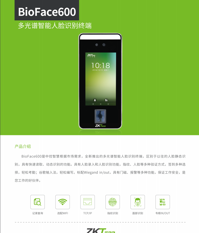• 產品描述:BioFace系列是ZKTeco熵基科技根據市場需求,全新推出的多光譜智能人臉識別終端,區別于以往的人臉靜態識別,具有快速讀取、動態識別的功能。BioFace具有人臉錄入和人臉識別功能,指紋、人臉等多種驗證方式,簽到多種選擇,輕松考勤;谷歌輸入法,輕松編寫。標配Wiegand in/out,具有門磁、報警等多種功能,守護您工作安全。